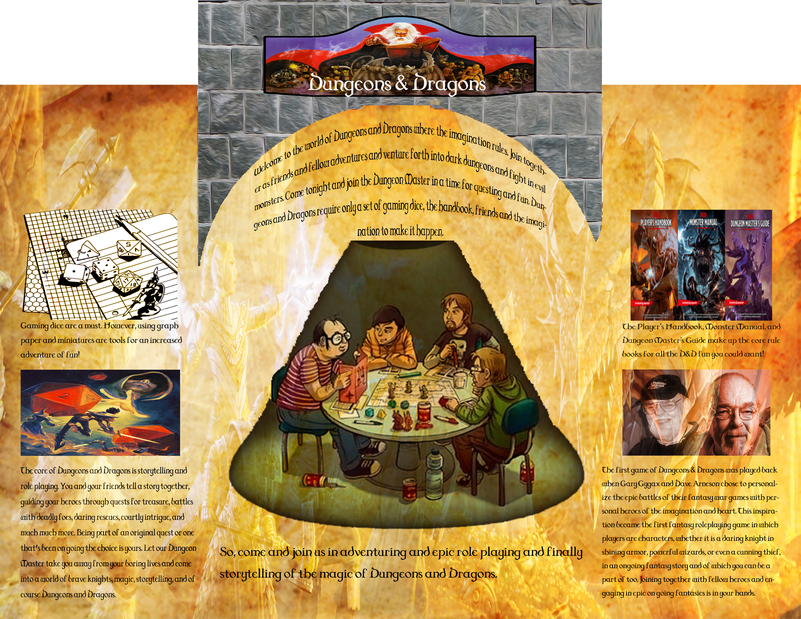 - Process (Programs, Tools, Skills): The process was done with mostly photoshop. I found an already made gate template and pretty much colored inside the lines. I had to us the rulers a lot to make sure things would match up on both sides. I pretty found a bunch of D&D pictures and applied them to the brochure. The inside has a blend of a background picture on a parchment template. I would put the doors up and make them transparent so I had a sense of where to put my pictures and type. A lot of it was kinda tedious to be honest.